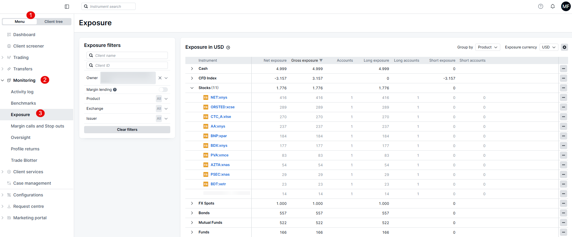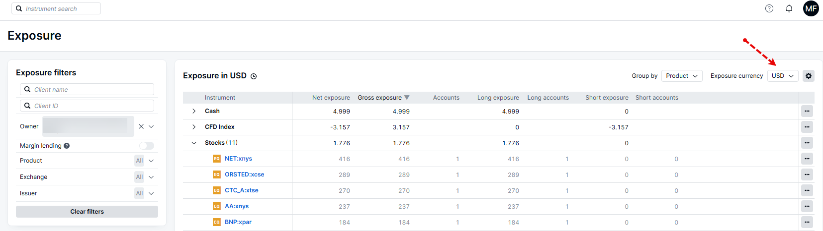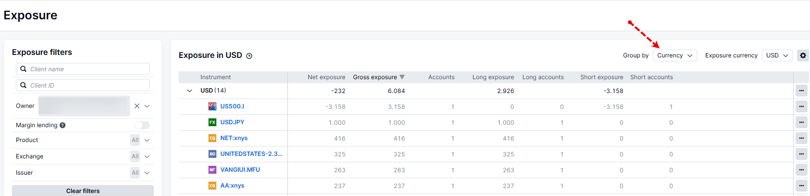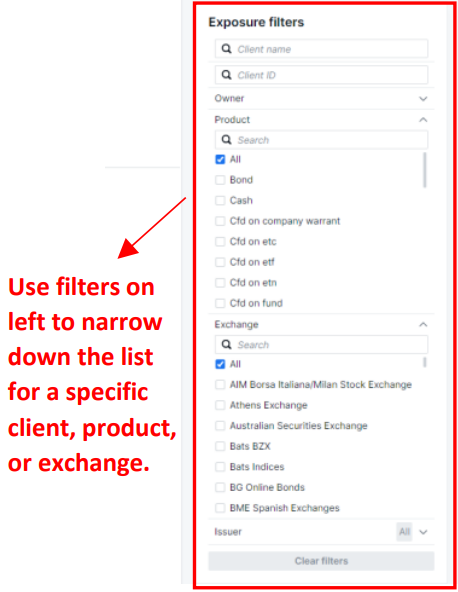 To see exposure for an individual client or sub-house within your hierarchy, users can input the client ID in the filters section or expand the owner filter to select a sub-house.