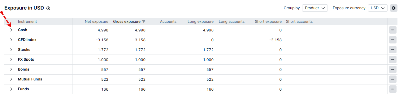 Initially collapsed, users can expand specific product types to see the underlying instruments held by clients, displaying both net and gross exposure of individual instruments. Expansion also reveals total holdings within a product type.