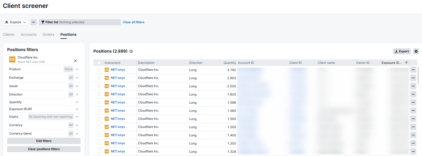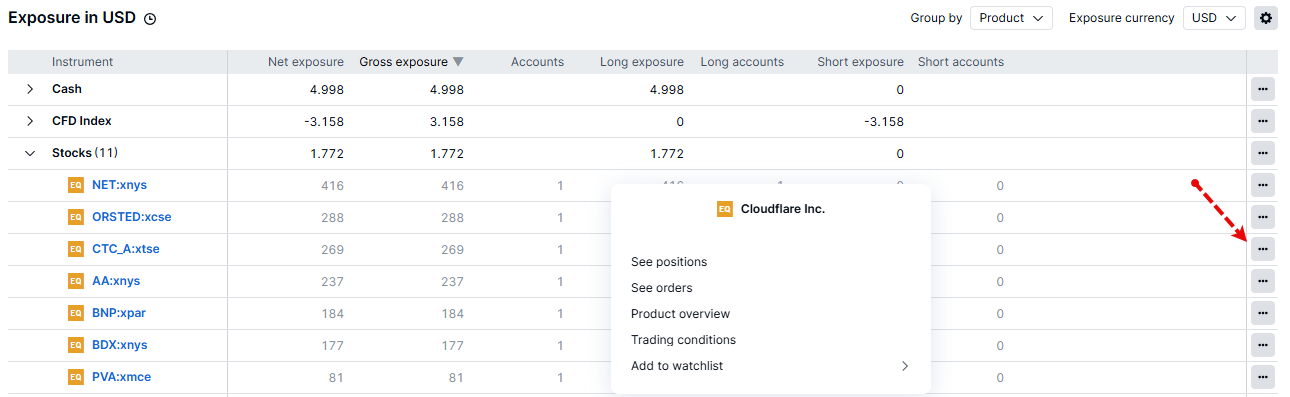 To see details of clients holding a particular instrument, click the ‘…’ on the right or right-click on the grid to select ‘See positions’.
