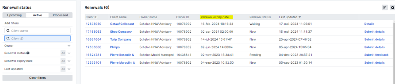 Upon initiating the regular, time-triggered renewal process, you will have 90 days to complete it. After this period, the client will be placed on Reduce Only and eventually terminated. You can monitor timelines based on the ‘Renewal expiry date’ in the Renewal tab.
