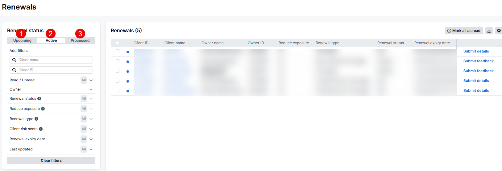 Clients requiring ODD appear in the module under 1. Upcoming, 2. Active and 3. Processed. Track client statuses including pending submission of additional information, those in progress, and processed indicating renewal completion.