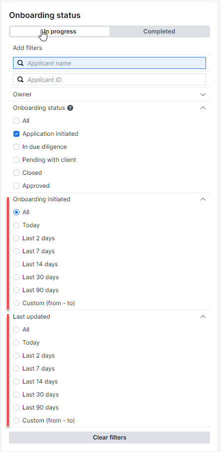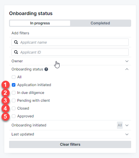 The "onboarding in progress" tile displays the current status of ongoing applications. You will find crucial details such as the applicant’s name, applicant ID, owner, and the onboarding status. Understanding these statuses is essential for efficient monitoring: