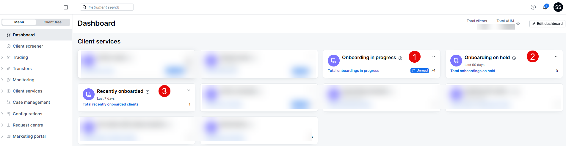 The "onboarding on hold" tile shows applications with the status "pending with client." These applications require additional information or action from you or the client. When an application has this status, it appears in the "onboarding on hold" section.
