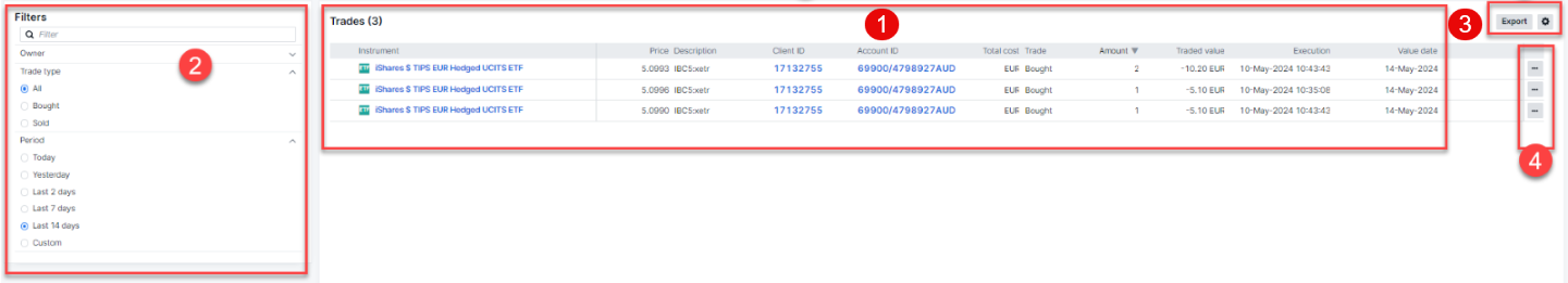 - Filters: Users have the capability to apply a variety of filters to refine the list of trades for specific transactions. The "Period" filter restricts searches to the last 14 days, ensuring users cannot look for trades executed beyond this timeframe.