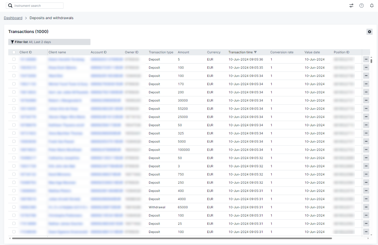 Selecting this tile will take you to the Deposits and Withdrawals page, where a detailed register of clients and their account transactions is presented. This register includes transfers and deposits, listed with the corresponding currency and any relevant exchange rates. It's important to distinguish between 'Transaction Time'—the actual time the transaction was executed—and 'Value Date'—the date the transaction affects the account balance: