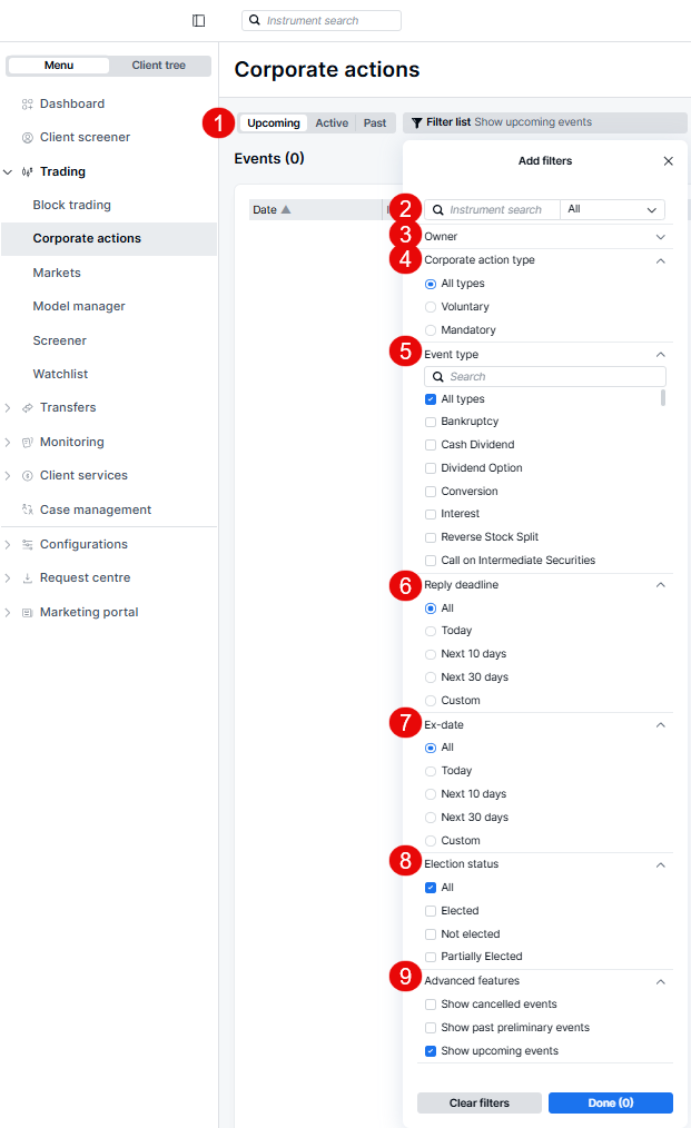 The Events Filter section provides a range of capabilities to help you effectively manage corporate actions. Here’s a breakdown of the key features: