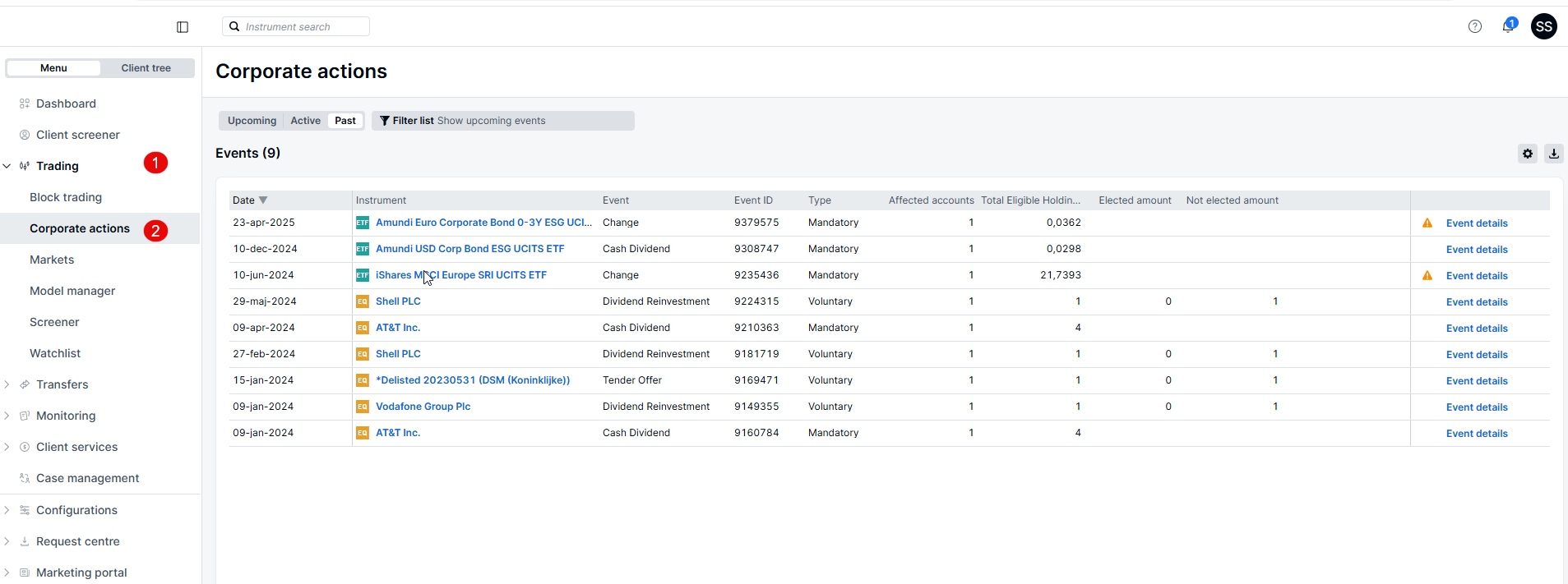 - Proceed to Corporate Actions for a comprehensive view of actions related to your clients.