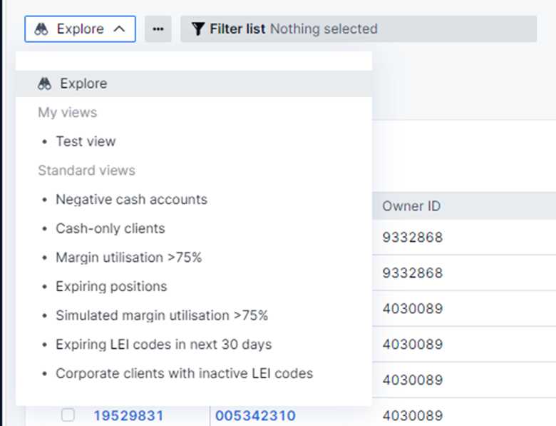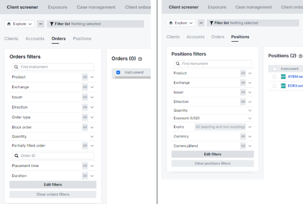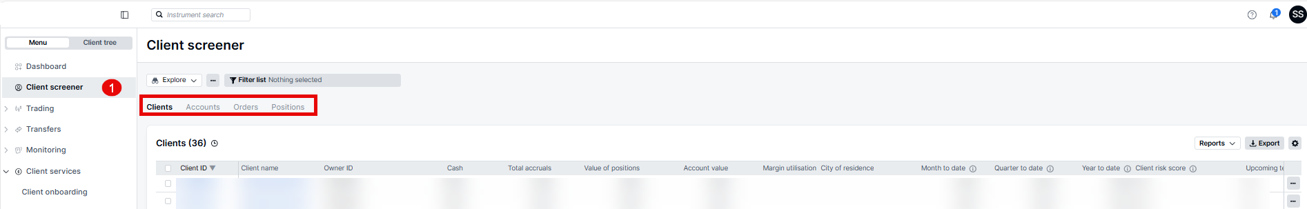 - Explore: The Explore view serves as the default landing page of the client screener, presenting users with all data related to clients, accounts, orders, and positions without any pre-selected filters. From this view, users can apply available filters to customize the grid according to their needs. It is important to note that any filters applied in the Explore view are temporary and not saved, so upon returning to Explore, users will see the client screener in its original default state.