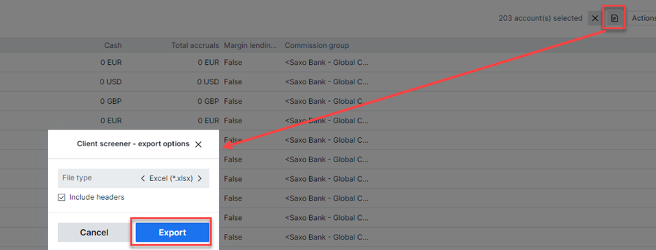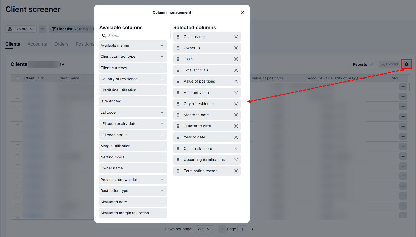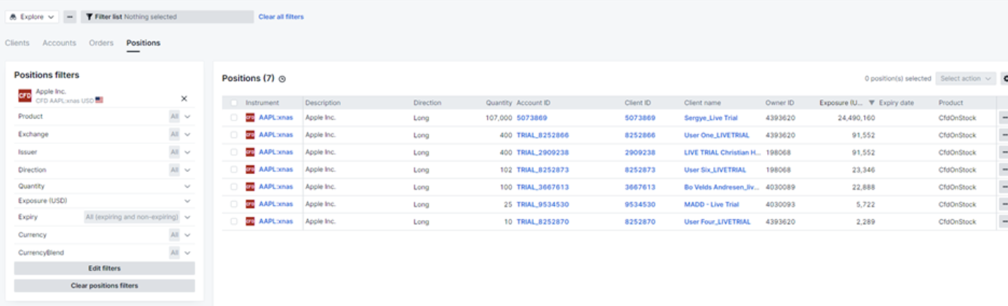 The Client Screener is a powerful search engine designed to efficiently filter data across multiple parameters. It enables users to apply various criteria on a single page, providing access to a consolidated view of client, account, order, and position data. The Client Screener can be utilized for a wide range of use cases, such as identifying clients with negative cash balances, filtering clients by their city of residence, and analysing margin utilization. This tool enhances data management and client analysis by offering comprehensive insights all in one convenient location.