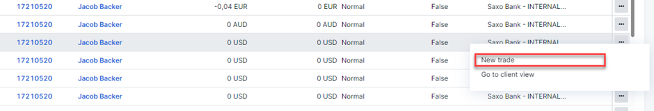 Context Menu: In the Accounts grid, users with trading rights can initiate a trade using the context menu. Note that the 'New Trade' option is unavailable to users without trading access.