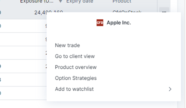Context Menu: The Positions tab includes a context menu for quick access to frequently performed actions. The screenshot below illustrates available actions within the positions grid. Note that trading-related actions, such as new trades and option strategies, are only accessible to users with trading rights.