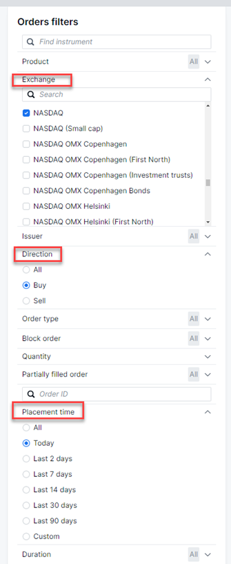 For example, users can filter to view all long orders placed today under the NASDAQ exchange using the filters as shown below.