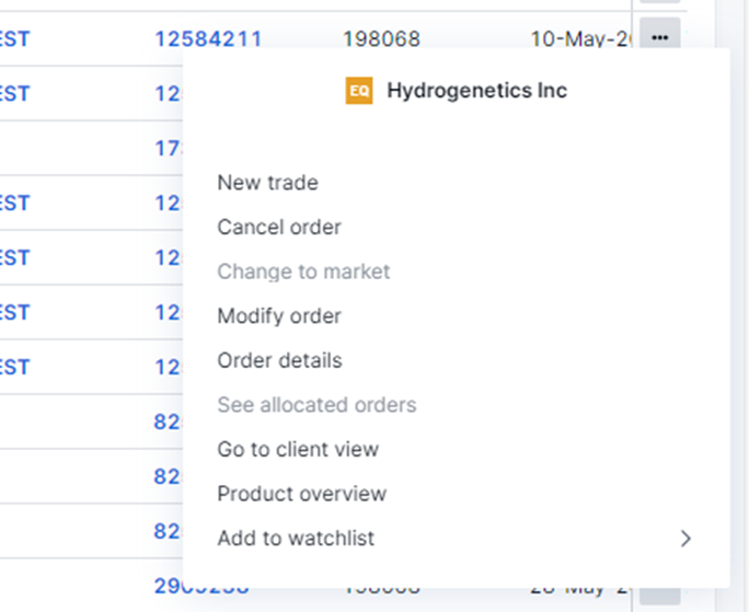 Context Menu: The Orders tab supports multiple actions from the context menu for quick user access. The screenshot below highlights different available actions. Note that all trading-related actions, such as canceling, changing to market, and modifying orders, are only accessible to users with trading rights