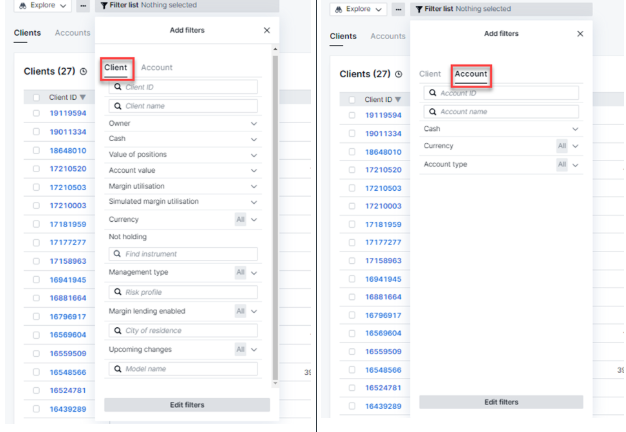 Account Type: Provides the ability to filter clients by specific account types. For example, users can view all clients holding a Pension account type.