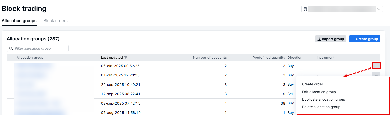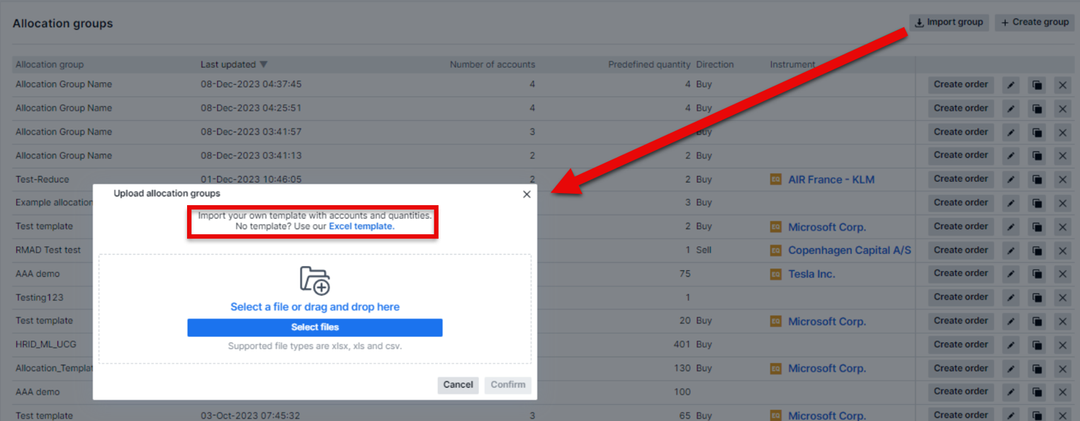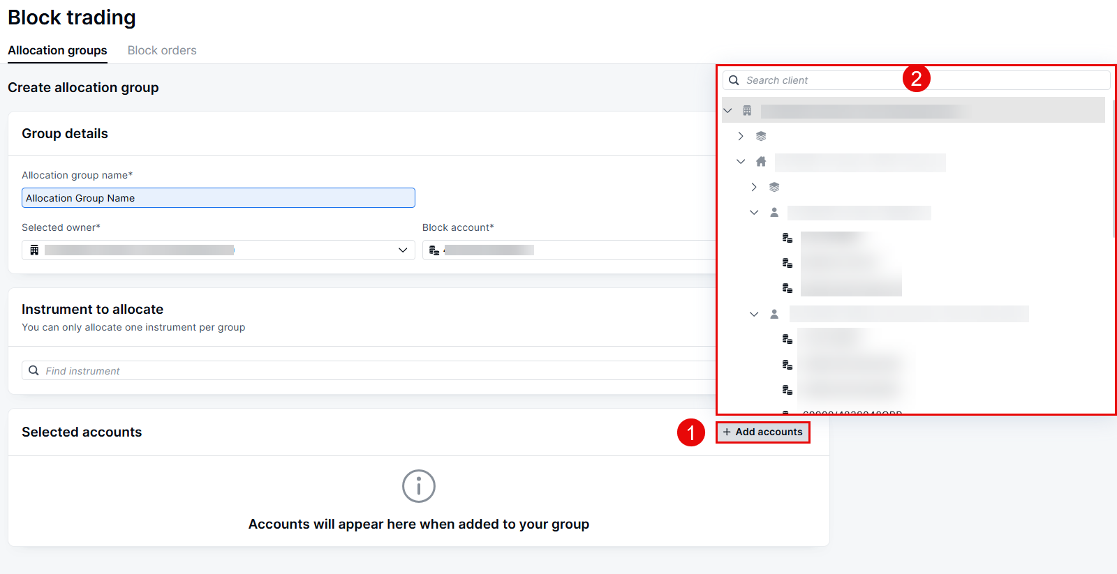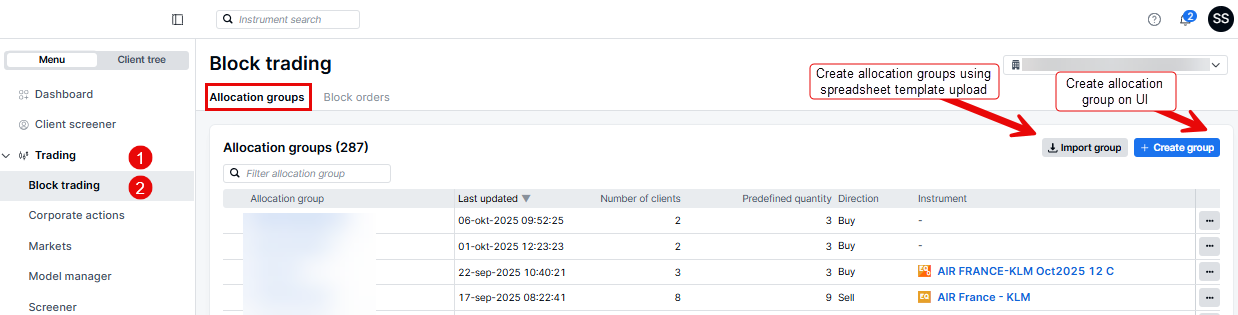 Allocation groups can be created within the 'Block Trading' module through either a spreadsheet template upload or by using the 'Create Group' button.