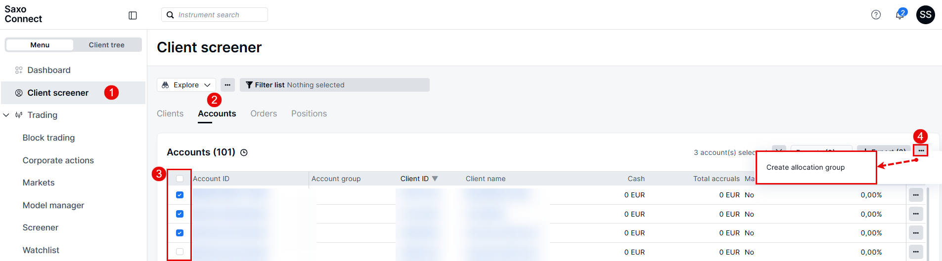 An ad-hoc allocation group can be formed by selecting accounts from the client screener.