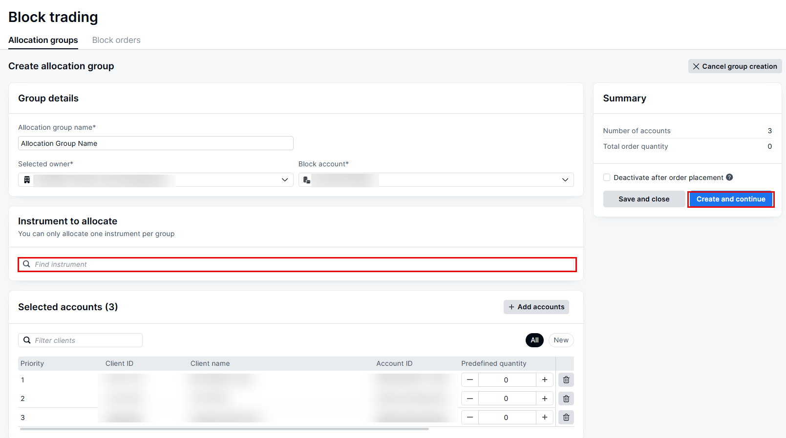 To proceed with creating a block order without saving the allocation group, select 'Create and Continue'.