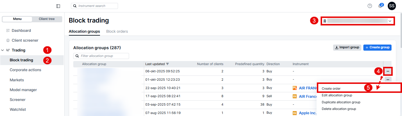 Click the three dots (4) and select 'Create Order' (4) next to the group you intend to use for block order creation.