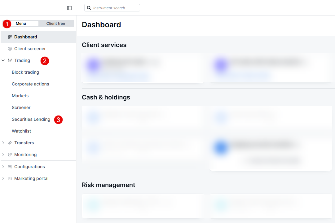 Access the Securities Lending module by selecting the menu (1), navigating to Trading (2), and then to Securities Lending (3).