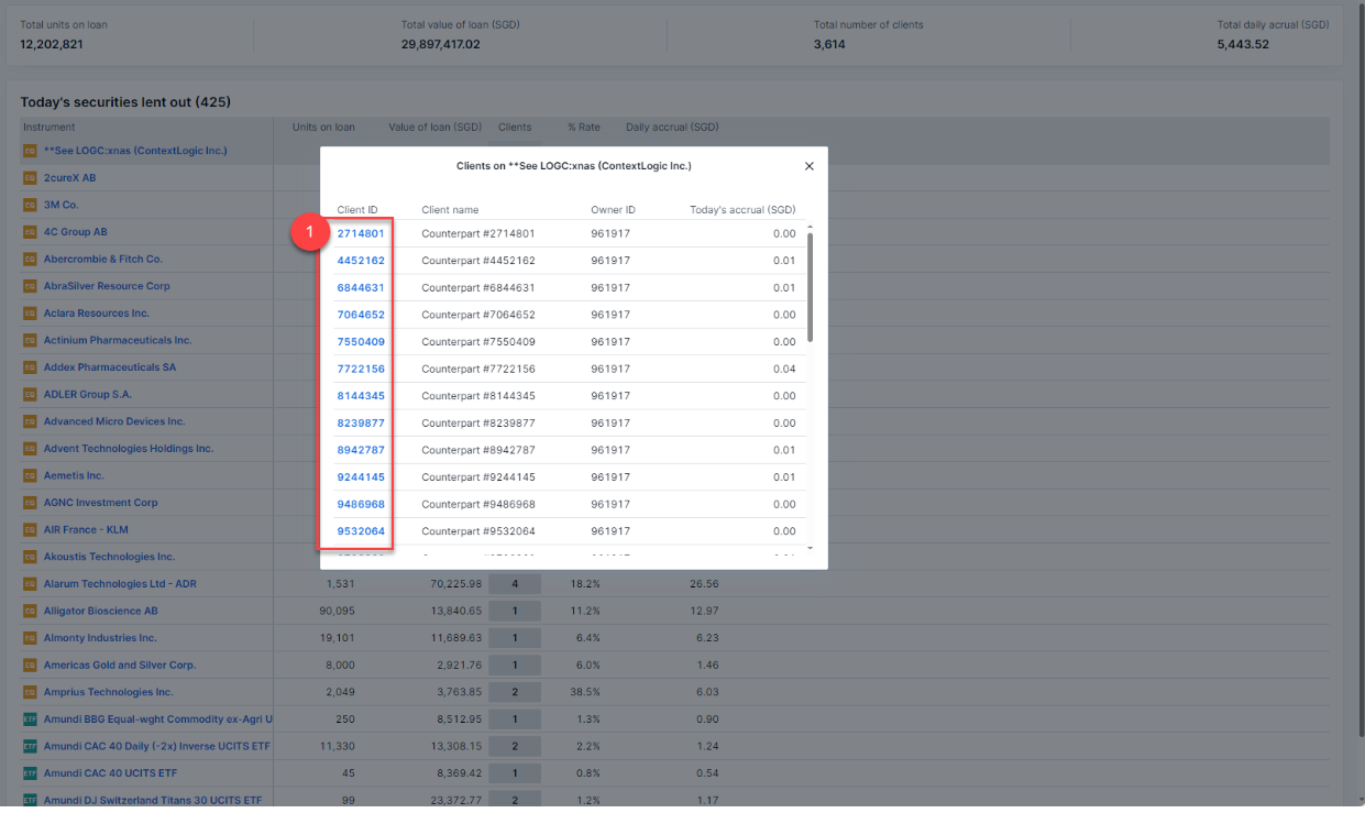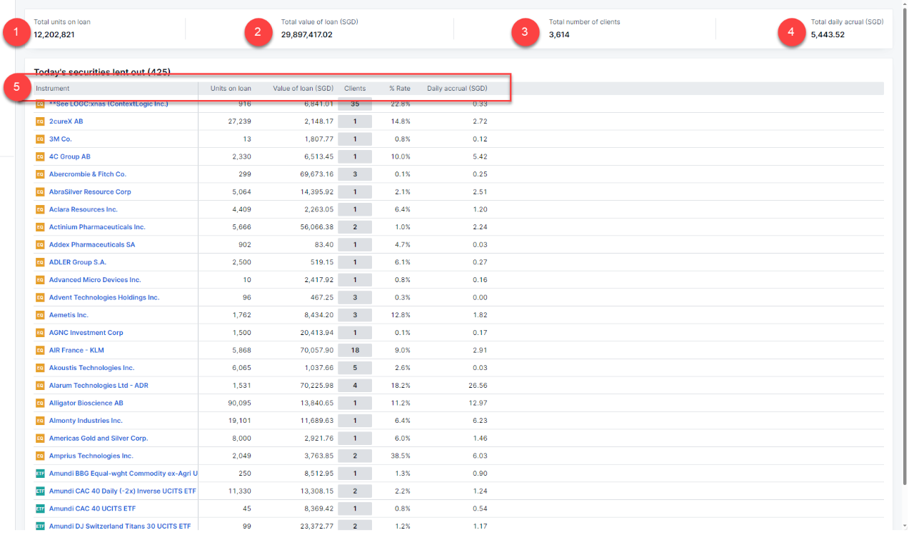 - Total daily accrual: Shows the daily earned income from lending securities, representing clients’ accrued earnings.