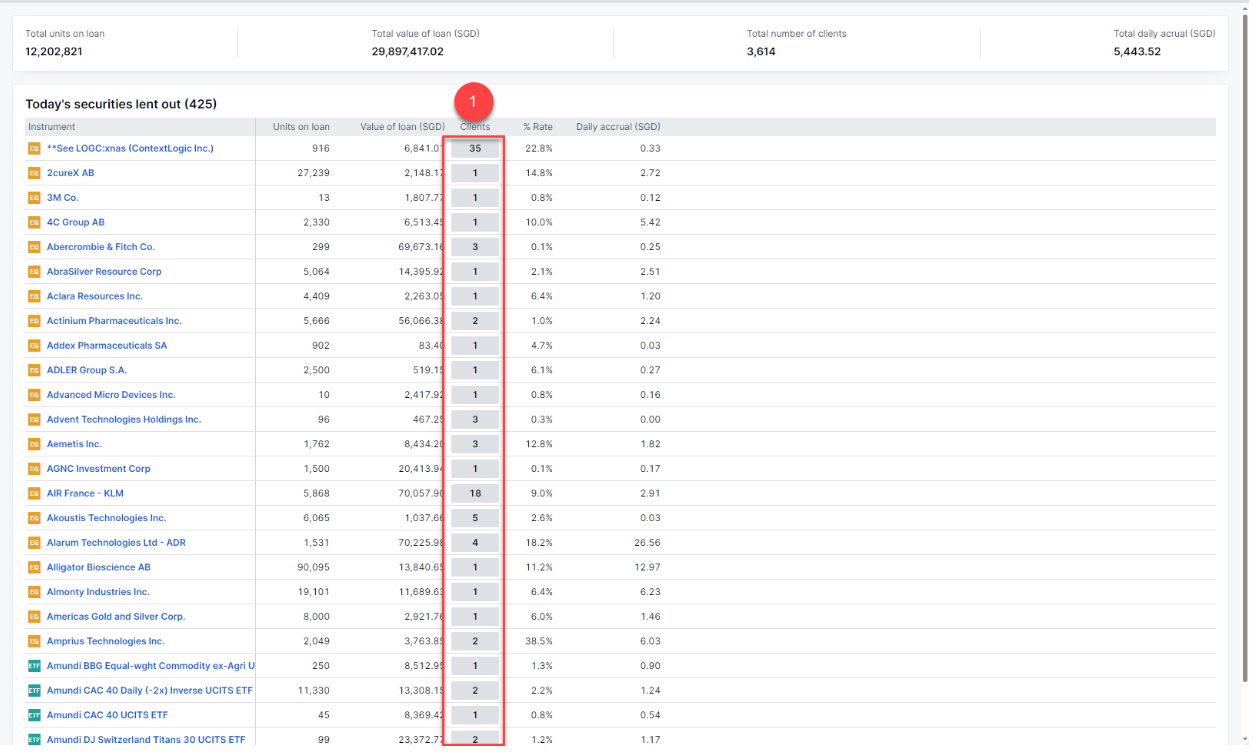 - Total number of clients: Indicates the number of clients utilizing securities lending.