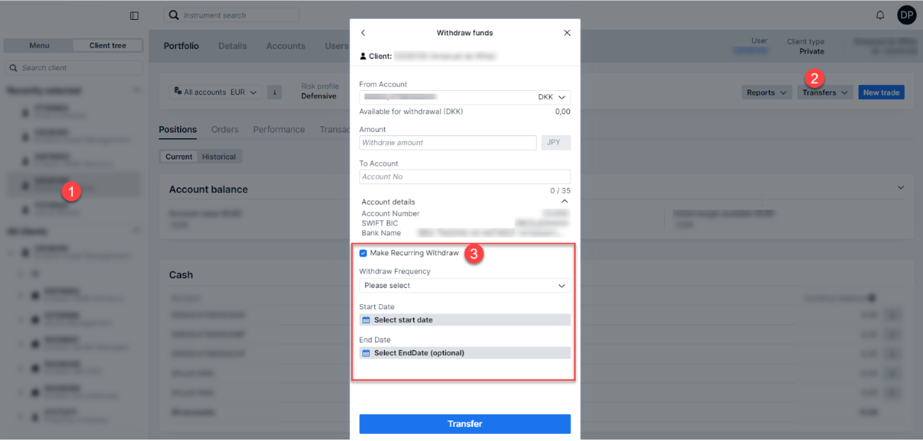 Recurring withdrawals allow asset managers to automate the process of regularly transferring funds from client accounts to predetermined destinations. This guide provides comprehensive instructions to help you streamline this setup, ensuring that withdrawals are conducted efficiently and align with clients' expectations.