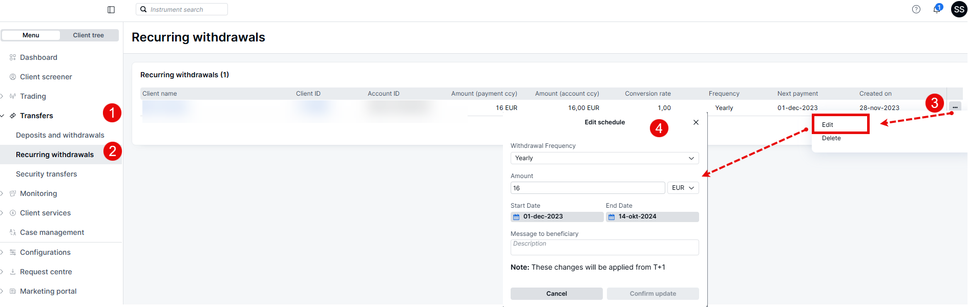 - Confirm the deletion to remove the recurring withdrawal from the client's account.