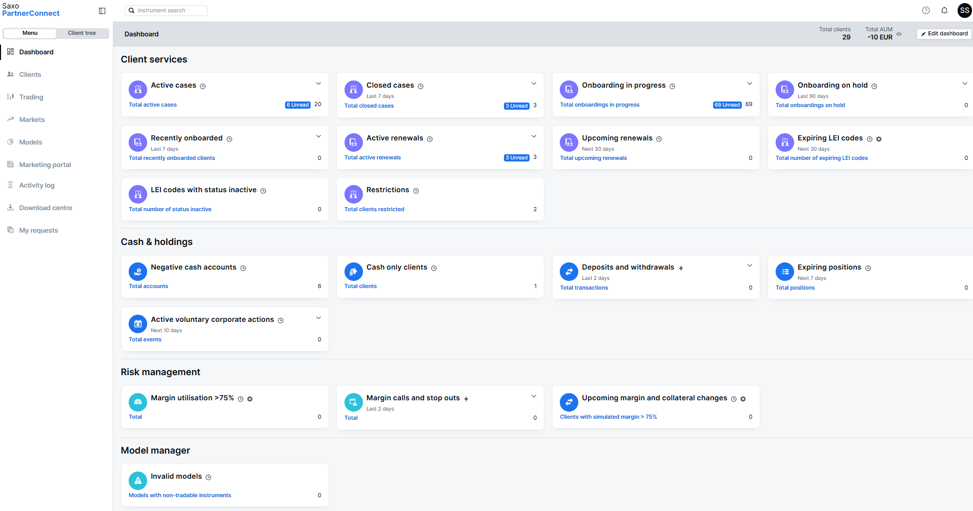 The platform enables the clients to create inquiries via the case management module and directly communicate with the relevant support department. In addition, it supports partners in areas such as client onboarding, risk management, reporting, transfer of assets, access to market analysis and research resources.