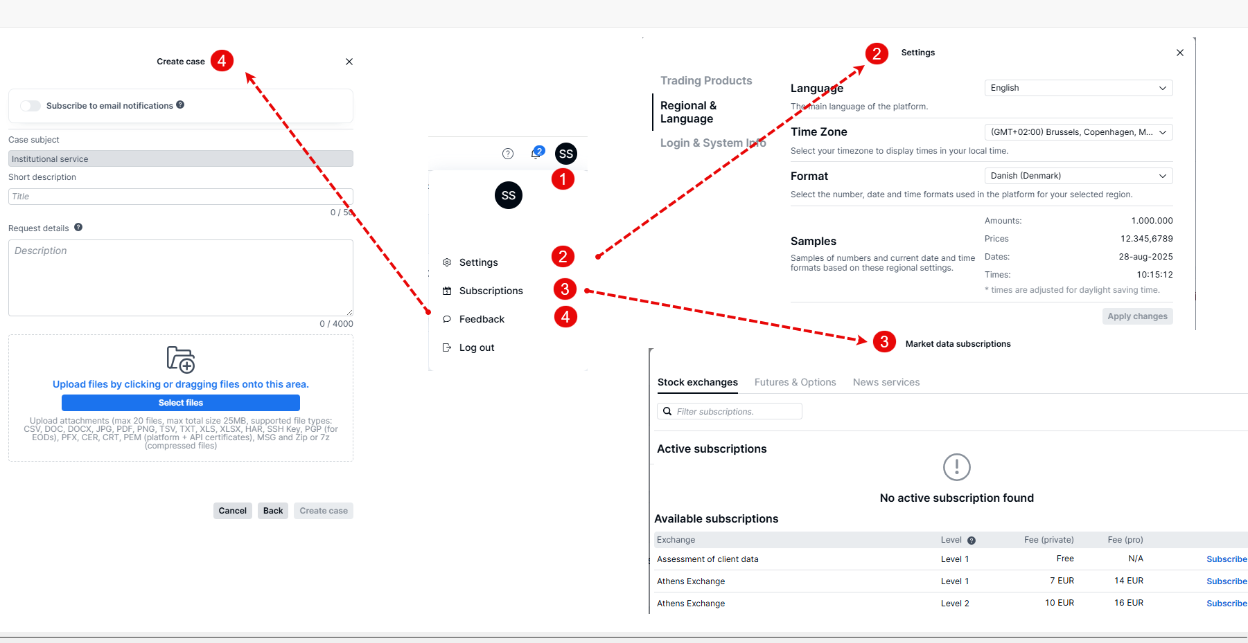 The last icon is your profile, and here you can see your platform settings (2), exchange subscriptions (3), provide platform feedback (4), and logout.