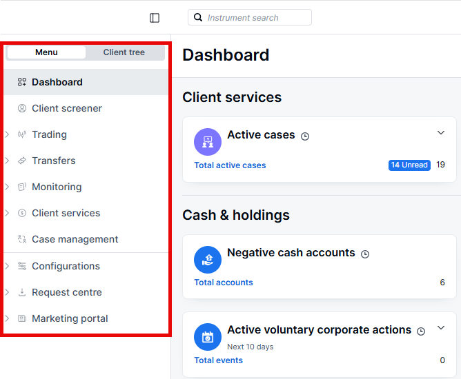 The menu allows users to effortlessly access information pertinent to their line of business, including trading, transfers (cash or positions), case creation, and client base analysis using the screener. To explore clients within the organization and view their specific portfolios, users can utilize the client tree tool.