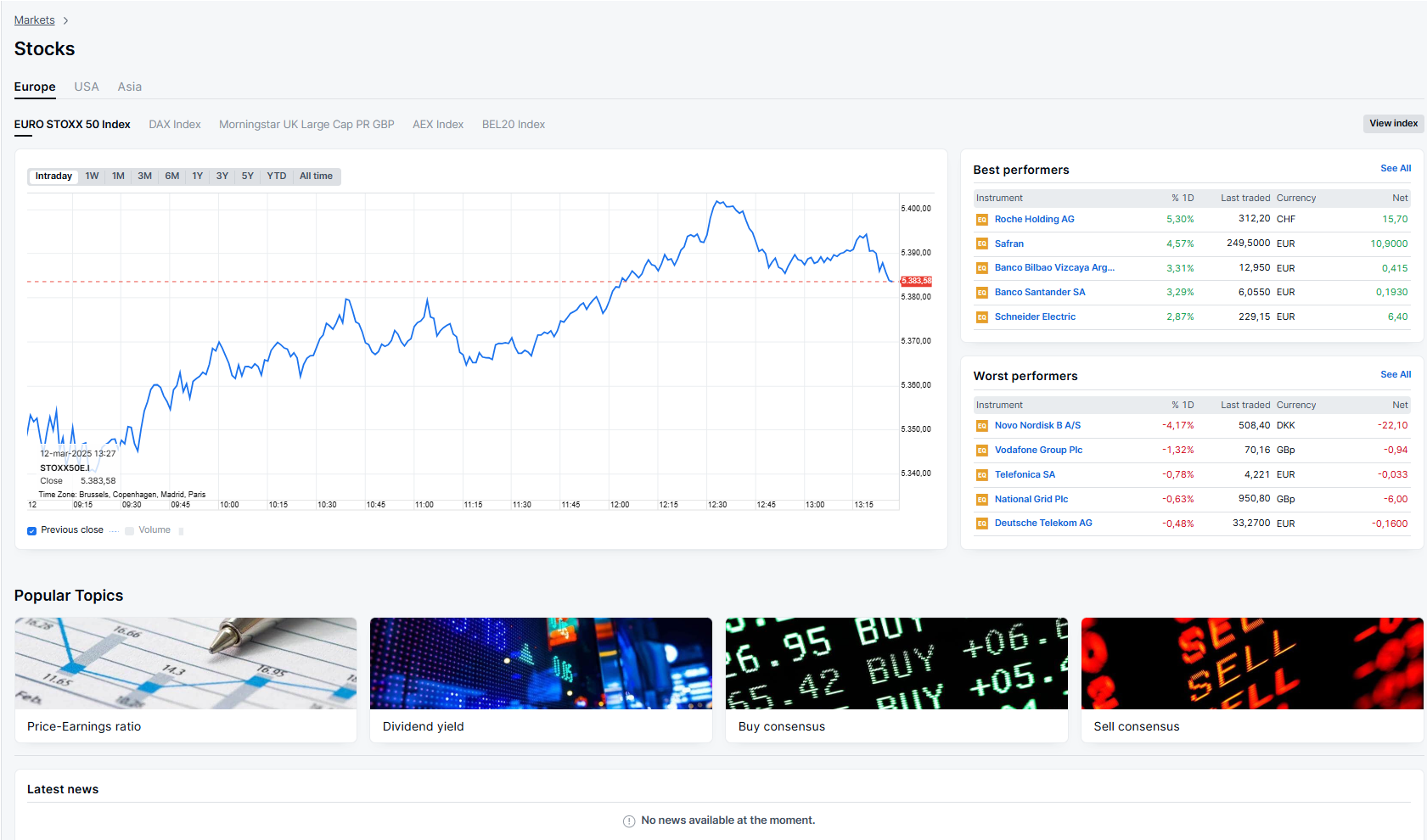 At the top of the page, you can click on different instruments to access pages tailored to each. If you click the stocks button, for example, you can see stocks sorted by country, sector, popularity, investment theme, and more. You can also see the upcoming earnings and dividends calendars.