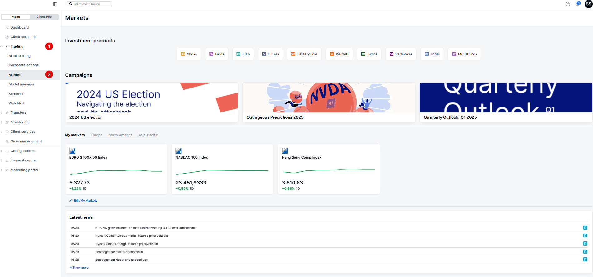 The markets module on the platform offers the user insight into the different products which are offered, their details, and also educational and informative articles.