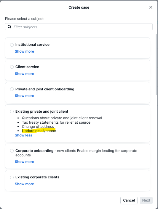 End clients of Money Managers have viewing rights only and can access the Monitor platform. To update contact details, the client must complete the Change of Contact Details form, and once the form is completed, the form must be submitted as a case to our Existing private and joint client, ensuring the client ID is mentioned in the case submission.