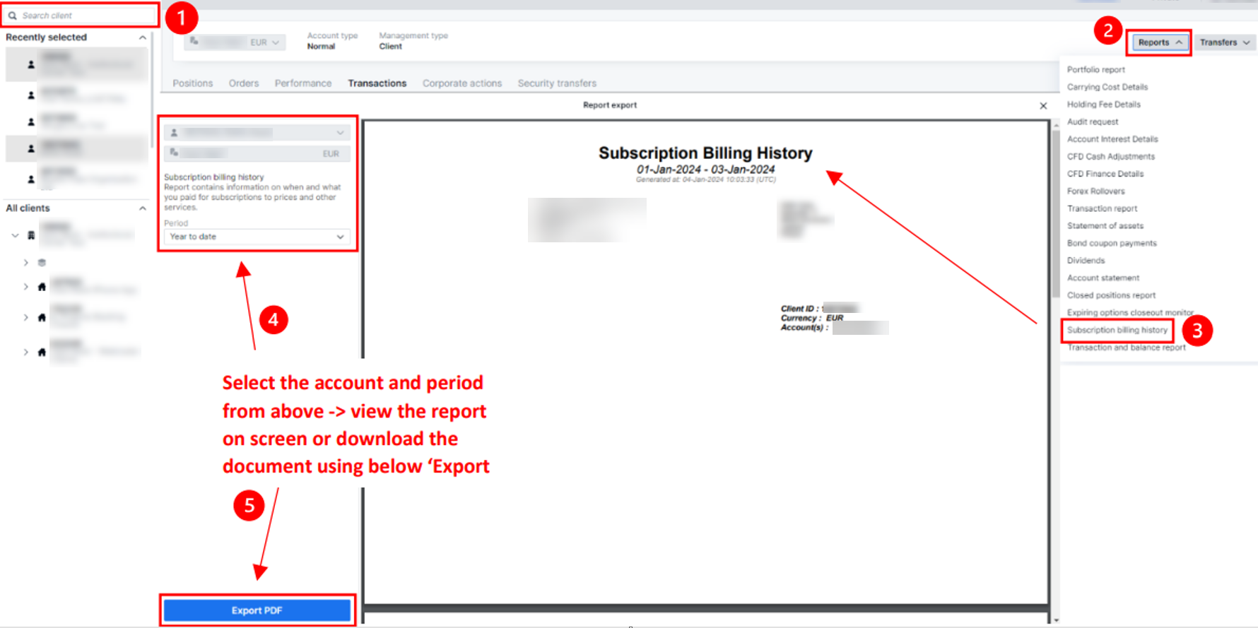 Users can view the subscription billing history details from the report menu. Select the 'Subscription billing history' report to access the details in PDF format.