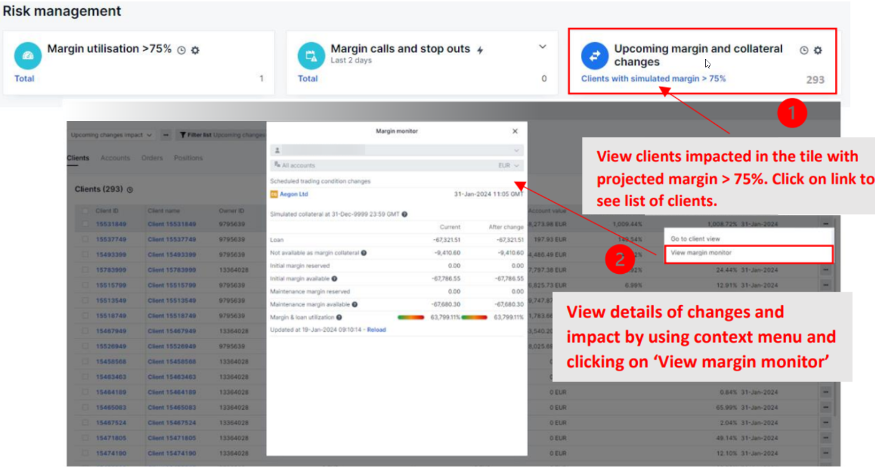 The platform provides partners with an overview of clients subject to margin reratings or margin changes, as well as the impact it may have on their margin utilisation. The information can be accessed through the Dashboard by navigating to Risk management and selecting Upcoming margin and collateral changes.