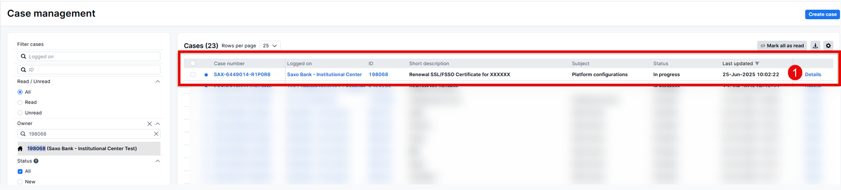 Open the case by pressing Details (1) and upload the SSL directly. The status of the case will now change to "In Progress".