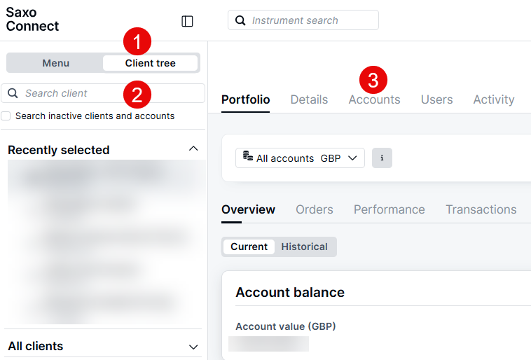 To find out how much cash is available to be withdrawn, navigate to the Client tree (1), locate the client (2), and click on Accounts (3).