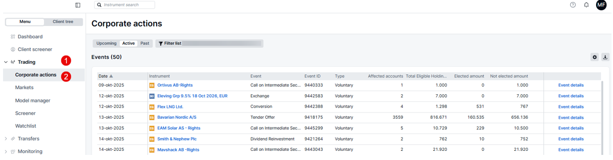 Within the trading platform, there's a seamless way to conduct bulk elections by navigating to Trading section of the platform. Here, you'll find the "Corporate Actions" module, which is specifically designed to manage and oversee corporate actions.