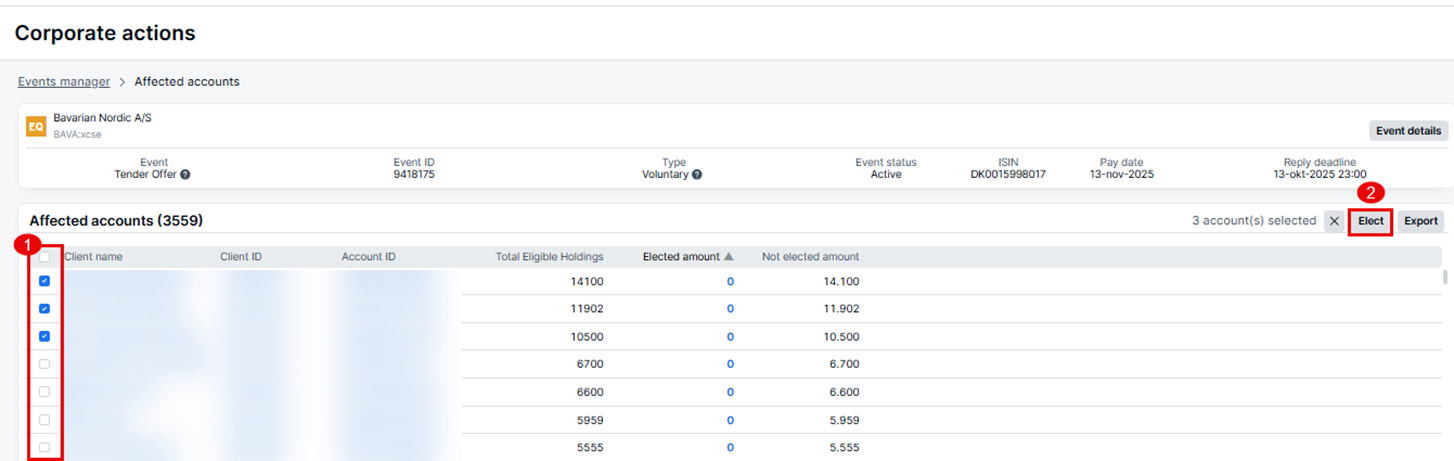 After reviewing the event details, you can proceed to select the clients for whom you wish to elect (1) and with the clients selected, press on the "elect" button (2).