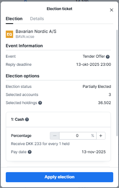 Please note The user must have the UserRole.+ Manage Corporate Actions on Hierarchy role to be able to elect on behalf of end-clients. |