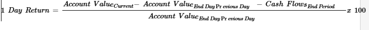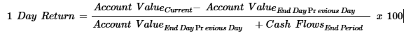 The 1 day return is calculated as the change in Account Value (the difference between the current day's Account Value and the previous day's Account Value), excluding closing costs and cash flows: