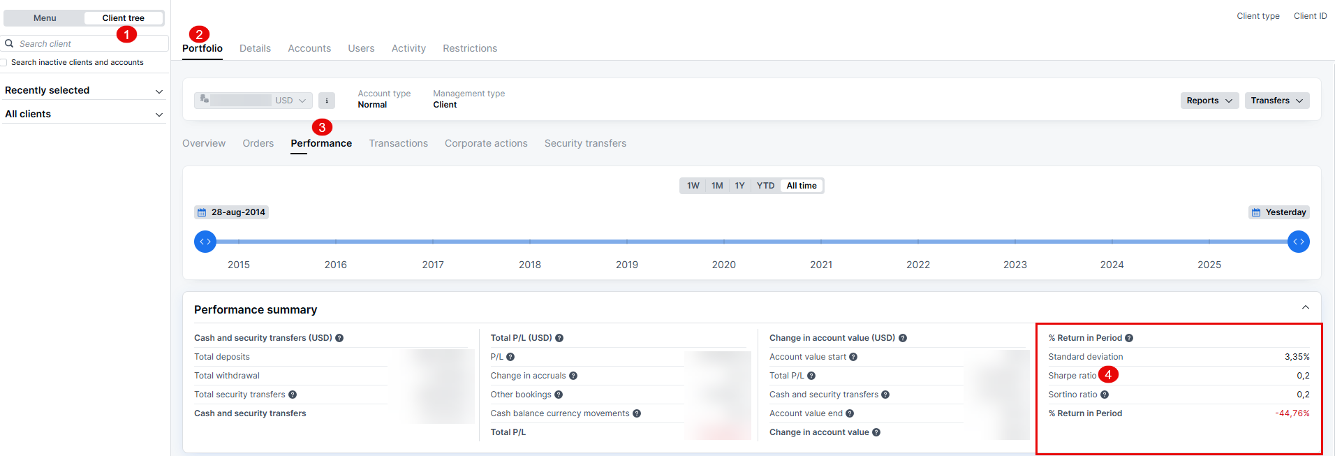 To view the Sharpe Ratio on the platform, first select your client from the client tree. Then, go to Portfolio and select Performance. Here, you can adjust the time period as needed. By clicking on the % Return in Period column, you will be able to find the Sharpe Ratio.
