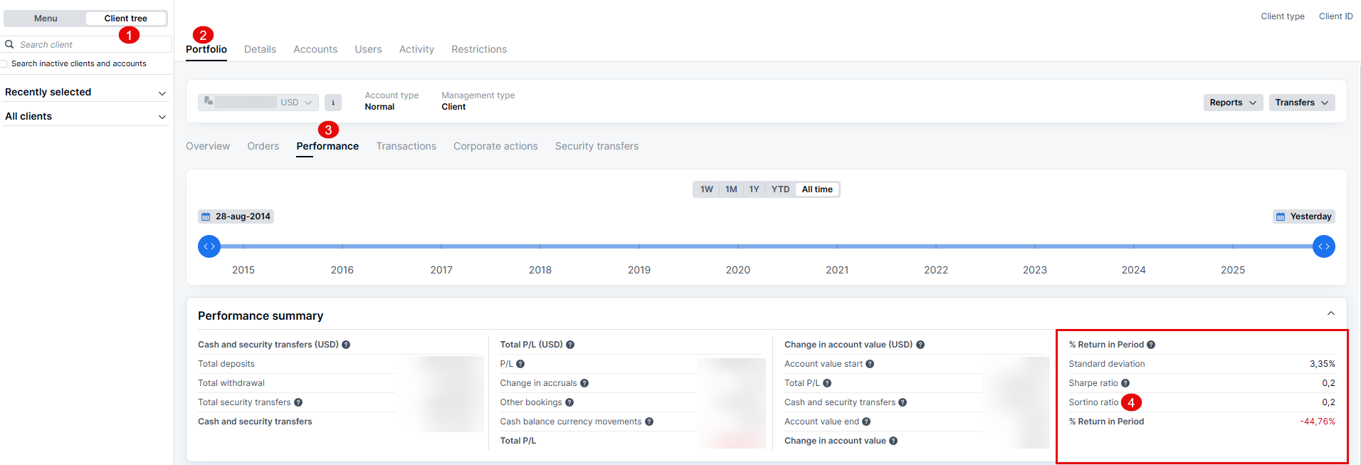 To view the Sortino Ratio on the platform, first select your client from the client tree. Then, go to Portfolio and select Performance. Here, you can adjust the time period as needed. By clicking on the % Return in Period column, you will be able to find the Sortino Ratio.