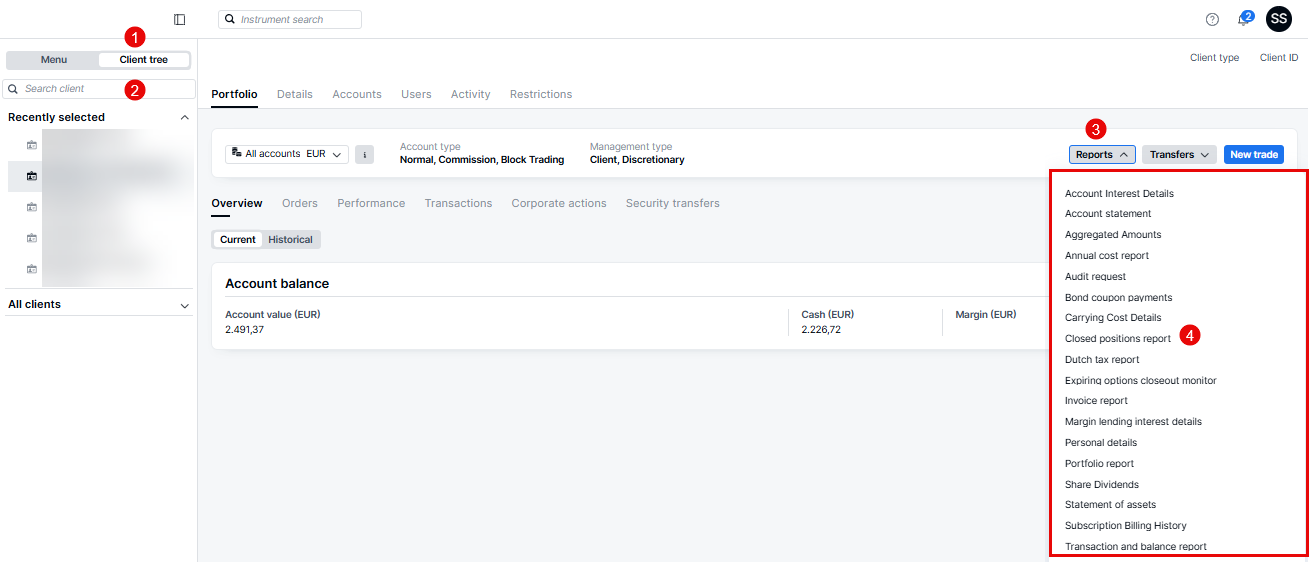 Navigate to the Client tree (1) > select the specific client (2) > Reports (3) > Closed positions report (4).