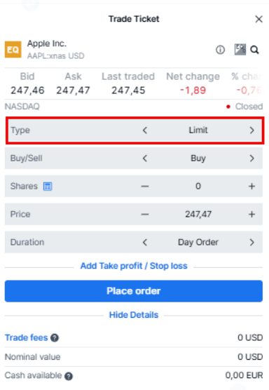 Example of a limit order Imagine that the current market price of share XYZ is USD 280 per share. You want to buy 10 shares at a maximum price of USD 250 per share, so you place a limit order to buy at USD 250. You set the duration to one week, meaning that the order will remain active for one week from the time it is placed. If the order is not executed within that time frame, it will expire. Scenario 1: The price of the stock drops to USD 250. Your order is automatically executed and you buy 10 shares at USD 250. Scenario 2: The stock price remains above USD 250 for a week ahead. Since your order had a duration of a week, the order will expire. In most cases, you can modify and cancel your order as long as it is active and has not been executed by navigating to Orders. |