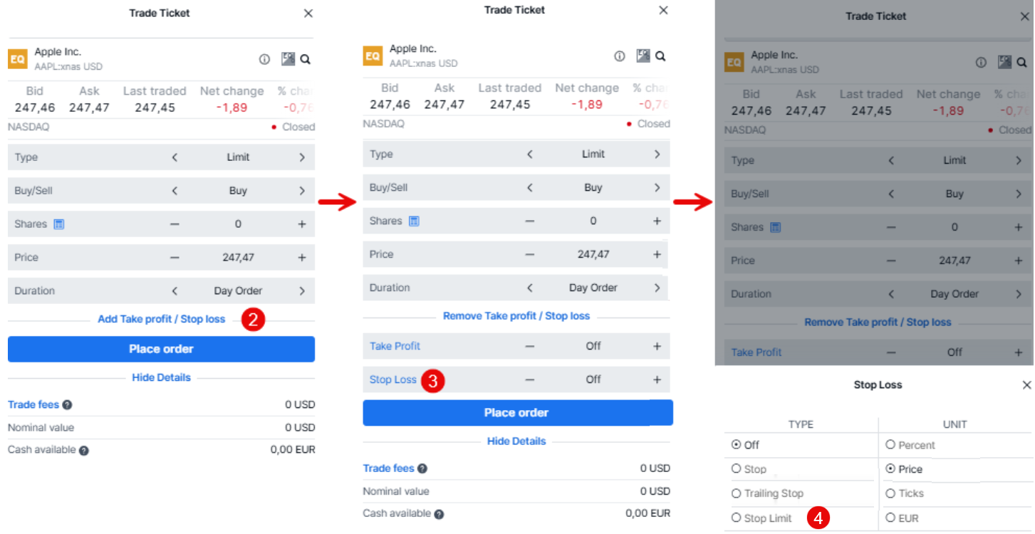 - In the Trade Ticket > Click Add Take Profit / Stop loss (2) > Click on Stop Loss (3) > Choose Stop Limit (4) > Choose a Unit > Set your stop-limit and click Place Order
