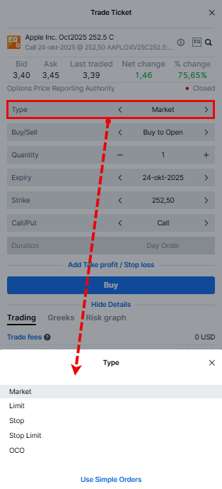 When opening a trade ticket on an ETO, click on the order type to select Stop or Stop Limit.