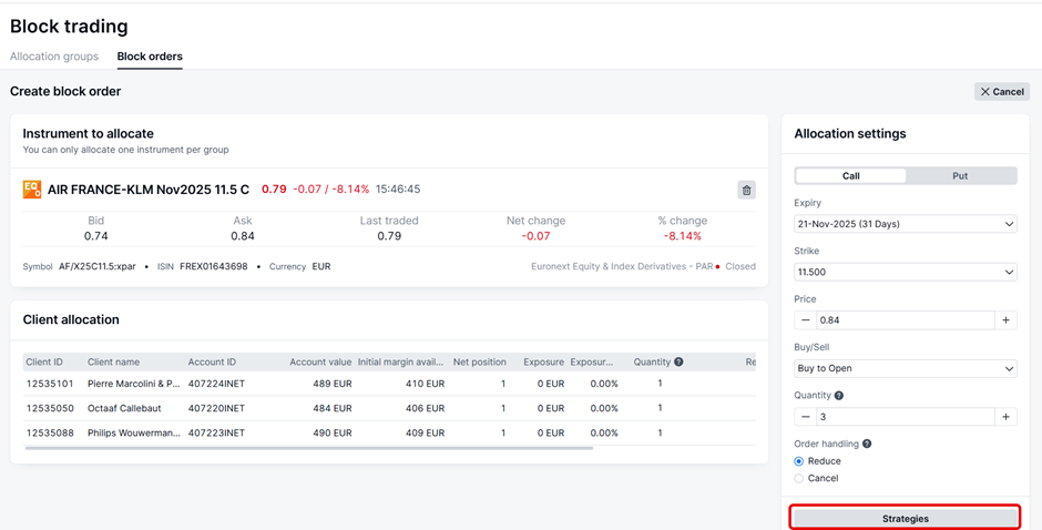 Users with trading permissions can place Block Orders for multi‑leg option strategies (for example, straddles and calendar spreads) directly from the platform.
