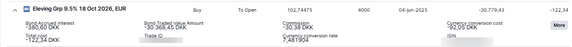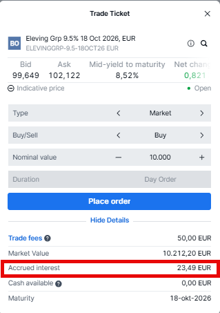 When buying bonds, you pay the Market value, Accrued interest and Trade fees when opening a trade.