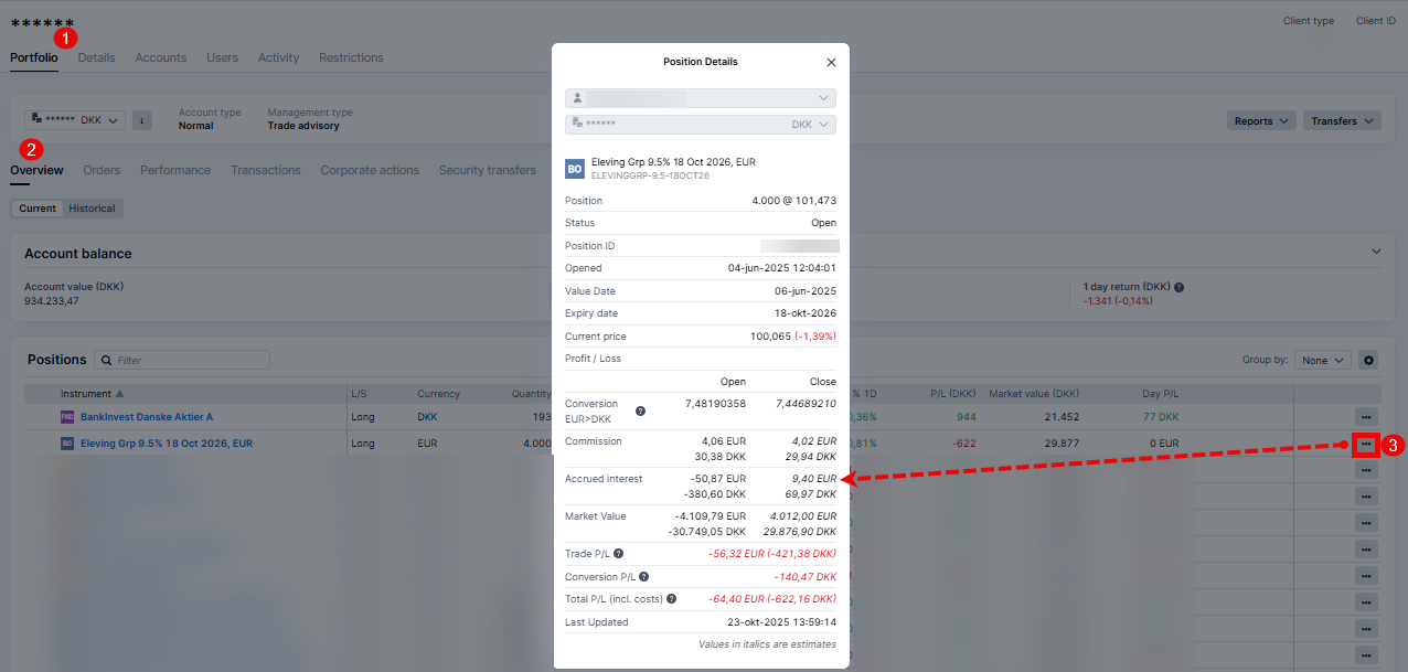 - Search for the client in the client tree > Portfolio> click on the button with [. . .] on the right end of the position > Position details